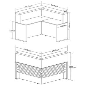 Característica do Balcão para Escritório /Recepção em L: - Sobretampo e laterais em Tamburato 50mm com fita de borda PVC com 1mm de espessura; - Tampos em MDP 18mm com fita de borda PVC com 1mm de espessura; - Longarinas em MDP 25mm com fita de borda PVC com 0,45mm de espessura; - Estrutura em MDP 15mm com fita de borda PVC com 0,45mm de espessura; - Sapatas plásticas com regulagem de altura; - Acompanha passa fio; - Capacidade de Carga: 50kg distribuídos; - Não acompanha objetos de decoração; - Montagem por conta do comprador;