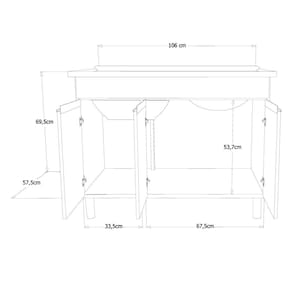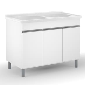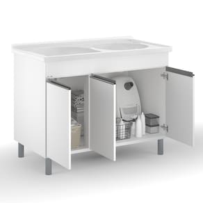 Balcao para Lavanderia 3 Portas 106cm com Tanque Duplo Amelia AJ Rorato O Balcao para Lavanderia Amelia AJ Rorato 106cm com 3 portas e uma opcao moderna e funcional para deixar a lavanderia mais organizada. Ele foi desenvolvido para acomodar um tanque duplo de 110cm, adaptando-se bem a espacos menores ou mais amplos, alem de oferecer um otimo espaco interno para guardar produtos de limpeza e utensilios proximos ao tanque. Sua estrutura e produzida em BP com revestimento em lamina melaminica texturizada, acabamento com bordas em fita PVC, travessas em madeira e assoalhos no estilo sanduiche, feitos com madeira de pinus de reflorestamento tratada em estufas e revestida em HDF dos dois lados. O tanque em marmore sintetico conta com espessuras reforcadas e cobertura granitada em gel coat, garantindo brilho intenso e resistencia.
