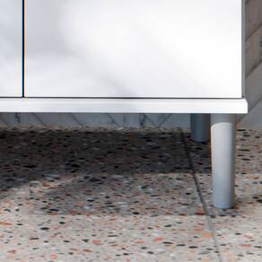 Os pés plásticos elevados, resistentes à umidade, completam a estrutura com durabilidade e facilitam a limpeza do ambiente.