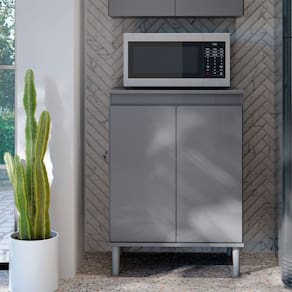 Balcão Para Micro Ondas Cinza O Balcão Micro-ondas alia funcionalidade e estilo para complementar sua cozinha com mais praticidade no dia a tampo resistente é ideal para acomodar micro-ondas ou pequenos eletrodomésticos com , oferecendo uma solução compacta e eficiente para o design clean, sem puxadores externos, o móvel traz um toque moderno e prateleira interna e o amplo espaço de armazenamento permitem organizar utensílios e mantimentos de forma prá pés plásticos elevados, resistentes à umidade, completam a estrutura com durabilidade e facilitam a limpeza do ões:Altura: 86,4 cmLargura: 61 cmProfundidade: 45 cmObservações:- Tampo ideal para micro-ondas ou pequenos eletrodomésticos- Sem puxadores externos, com visual moderno- Prateleira interna e amplo espaço de organização- Pés plásticos elevados, resistentes à umidade