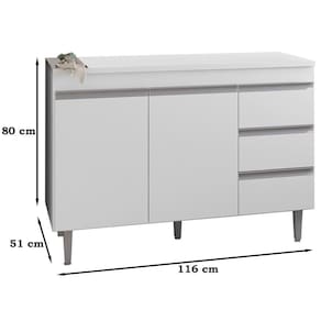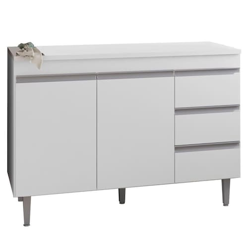 Balcao Para Pia 116 cm 2 Portas Andreia, é ideal para quem busca qualidade e sofisticação para compor sua cozinha da forma que desejar. Estrutura em MDP de 12 e 15 mm, acabamento com pintura UV (Brilho/Fosco). Composto por 2 portas articuladas com dobradiças metálicas, 3 gavetas com corrediças metálicas com deslize suave, espaço para colocação de pia (pia não inclusa), prateleira interna, puxadores em alumínio, acompanha pés em PVC. Este é um módulo avulso dos produtos REAJL, você pode adquirir outras peças dessa composição que são vendidas separadamente. Produzido com controle de qualidade e com excelente acabamento. Este móvel chegará na sua casa separado em 1 volume.