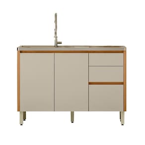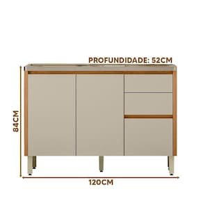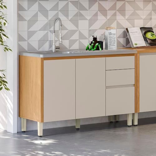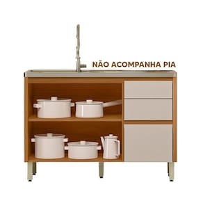 MDFPossui 3 gavetas amplas com corrediças telescópicas, sendo uma delas com divisor de talheres, e 2 portas com prateleira interna, oferecendo amplo espaço para organização de utensílios, panelas e mantimentos. As dobradiças com amortecimento proporcionam fechamento suave e silencioso, enquanto as portas chanfradas com bordas soft destacam o visual sofisticado do produto.