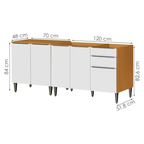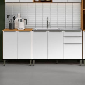 MDFBalcão para Pia e Balcão com Tampo, design pratico e resistente para transformar sua cozinha. Estrutura em MDF (15/12 mm) e acabamento em Verniz. Possui portas com dobradiças metálicas, gavetas com corrediças telescópicas, puxadores e pés em plástico (pés 15 cm, regulagem de 3 cm) e prateleiras internas. Tampo não incluso (não acompanha pia). Estes produtos serão entregues em 2 volumes.