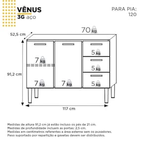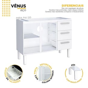 A linha de armários em aço para cozinha Vênus Flat, da Cozimax, é resistente, fabricado em aço eletrogalvanizado com garantia de 5 anos, protegido por pintura em pó eletrostática, possui portas com design moderno e cantos retos, puxadores em ABS com acabamento metalizado. Acabamento da Prateleira: Pintura Escala de Brilho da Prateleira: Fosco Acabamento da Gaveta: Pintura Escala de Brilho da Gaveta: Brilhante Material do Puxador da Gaveta: ABS Acabamento da Porta: Pintura Escala de Brilho da Porta: Brilhante Material do Puxador da Porta: ABS Altura dos Pés: 21 cm Altura Máxima dos Pés: 21.0000 Ambiente Principal: Cozinha codigo_ean: 7909903175477 Complexidade da Montagem: Média: pode ser montado por mais de uma pessoa e/ou necessite de maior conhecimento para montagem Cor: Branco Cor do Produto: Branco Cor Interna: Branco Escala de Brilho: Brilhante Gaveta com Chave: Não Itens Inclusos: 1 Armário, Kit Ferragens e Manual de Montagem Linha ou Coleção: Vênus Manual de Montagem e Instalação: https://product-hub-prd.madeiramadeira.com.br/808948/documents/f1aea6a5-a62d-43d6-9784-de3d6b093161flat1001203gcertf445322xa4.pdf Material da Dobradiça/Corrediça da Porta: Metálica Material da Gaveta: Polipropileno Material da Porta: Aço Material da Prateleira: Aço Material dos Pés: Polipropileno Necessita Montagem: Sim Origem do Produto: Nacional Pés Reguláveis: Sim Peso: 23 kg Peso Máximo por Gaveta: 5 kg Peso Máximo por Prateleira: 7 kg Possui Espelho: Não Possui Possui Pés: 04 Possui Portas: Sim Possui Prateleiras: Sim Possui Rodízio: Não Produto Montado: Sim Recomendações de Uso, Manutenção e Limpeza: Pano Umedecido Sapatas Niveladoras: Sim Sistema de Montagem: Parafusos Suporta Até (kg): 70 kg Tipo de Corrediça da Gaveta: Simples Tipo de Dobradiça/Corrediça da Porta: Simples Tipo de Puxador da Gaveta: Externo Tipo de Puxador da Porta: Externo