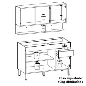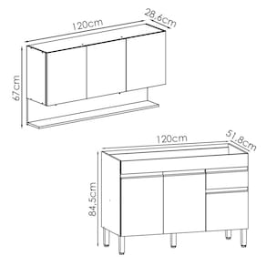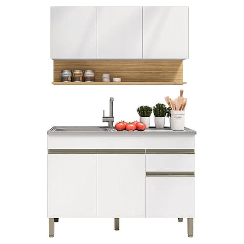 Balcão Para Pia e Armário Aéreo para quem busca praticidade na organização da cozinha. Produzido em MDP (15mm) com acabamento em pintura UV texturizada. Conta com 06 portas (portas superiores com sistema passante), 01 gaveta, 01 nicho inferior, dobradiças e corrediças metálicas e 01 prateleira interna. Os pés reguláveis são em plástico resistente e os puxadores em perfil alumínio (pintura epóxi). Não acompanha pia nem tampo. Este produto será entregue em 03 volumes.