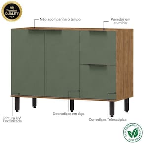 Características Gerais do Produto: - Acabamento: Pintura UV Texturizada / Alto brilho - Acompanha Manual: Sim - Altura (cm): 89,50cm - Largura (cm): 120cm - Profundidade (cm): 51,6cm - Peso (Kg): 37,51kg - Corrediças: Telescópica - Matéria-prima: MDF 15mm Puxadores em alumínio Dobradiças em aço com amortecimento - Quantidade de gavetas: 2 Gavetas externas, 1 gaveta interna - Garantia: 3 Meses - Quantidade de Portas: 2 - Requer montagem: Sim