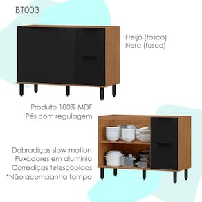 Materiais: Estrutura 100% MDF (chapa de 15mm), puxadores em alumínio, dobradiças slow motion, corrediças telescópicas, gaveta oculta e pés com regulagem.