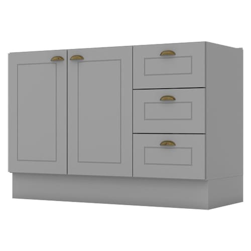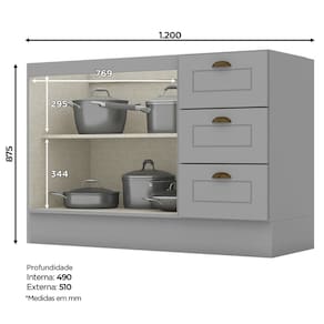 Balcao Pia 2 Portas 3 Gavetas 120 cm, cozinha provençal seu conceito é inspirado nas clássicas cozinhas estilo americano. Estrutura 100% MDF de 15mm (fundo em MDF de 3mm), portas com dobradiças metálicas 35mm com amortecimento e 3 gavetas equipadas com corrediças telescópicas para um deslizar suave e silencioso, puxador em Metal Zamac com um design elegante. Montagem das gavetas pode ser realizada do lado esquerdo ou direito. Pintura UV texturizada proporciona um acabamento sofisticado e fácil de limpar, opção de instalação sem pés, suspensa (ferragens para fixação na parede inclusas). Conta com 1 prateleira suportando até 8kg. Ideal para tampo de 1200 x 535 mm (NÃO ACOMPANHA TAMPO). Com espaço amplo para colocar seus mantimentos e utensílios com facilidade. Este móvel chegará na sua casa separado em 01 volume.