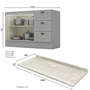 Balcão Para Pia Com Tampo 120 cm, cozinha provençal seu conceito é inspirado nas clássicas cozinhas estilo americano. Estrutura 100% MDF de 15mm (fundo em MDF de 3mm), possui rodapés com opção de instalação sem rodapés suspensa (ferragens para fixação na parede inclusas). A pintura UV texturizada proporciona um acabamento sofisticado e fácil de limpar. Com tampo de 120 x 535. O produto pode ser montado para os dois lados, direito e esquerdo. Este móvel chegará na sua casa separado em 02 volumes.