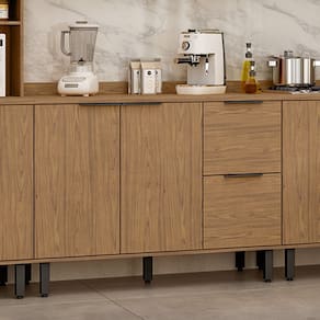 Materiais: Estrutura 100% MDF (chapa de 15mm e tampo de 22mm), puxadores em alumínio, dobradiças slow motion, corrediças telescópicas, gaveta oculta, pés com regulagem e tampo.