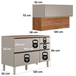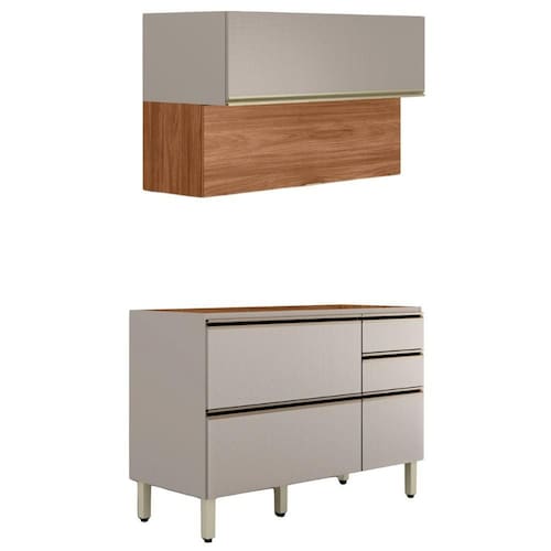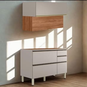 Sofisticado e funcional, o Conjunto Balcão e Armário Proença foi pensado para otimizar o espaço com elegância. Produzidos 100% em MDF (15 mm) com acabamento em pintura UV. Conta com portas basculantes com pistão a gás e dobradiças metálicas de 35 mm, gavetas laterais (uma com divisor de talheres) e gavetão inferior, equipadas com corrediças telescópicas, pés com regulagem de altura e puxadores em alumínio. PIA/TAMPO, NÃO INCLUSO. Este produto será entregue em 03 volumes.