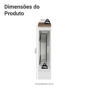 Cor: Branco | Garantia: 12 meses | Dimensões - Altura: 84 cm | Dimensões - Largura: 20 cm | Dimensões - Profundidade: 52 cm | Produto: Cozinha | Marca: Madesa | Peso aproximado: 14 kg | Material: MDP | Estado de Origem: RS | Conteúdo da embalagem: 1 Balcão Gabinete | Material para Filtro: MDP | Instruções/Cuidados: Utilize um pano limpo, levemente umedecido e seque em seguida a superfície. Não usar produtos químicos ou abrasivos para a limpeza. Recomendamos polir seu móvel com lustra-móveis duas a três vezes por ano. | Produto precisa de Montagem?: Sim | Peso Produto Com Embalagem (Kg): 14,00 | Altura do Produto com Embalagem (cm): 57,90 | Largura Produto Com Embalagem (cm): 50,40 | Comprimento Produto Com Embalagem (cm): 80,80 | Descrição do Tamanho: 84 cm x 20 cm x 52 cm | Nome do Simples no Fornecedor: Balcão Porta-Temperos 20 cm 1 Porta Branco/Tampo Rustic Vik Madesa | Fabricante: Madesa | RBN: Casa/Móveis/Móveis de Cozinha | Materiais do corpo: MDP | Quantidade de caixas de embalagem: 4 | Bullet Point 1: Dimensões: 84 cm altura x 20 cm largura x 52 cm profundidade | Bullet Point 2: O organizador metálico interno possui deslizamento suave com abertura total. | Bullet Point 3: O puxador ponto em ouro envelhecido, feito com metal resistente, trazem personalidade e um charme único. | Bullet Point 4: Possui acabamento de alta resistência, conservando a beleza do móvel por muito mais tempo. | É Frágil: Não | Quantidade de Itens: 1 | Certificação de teste externa: Sim | Precisa de baterias ou pilhas: Não | da peça (part_number): G24208J5VK | Peso do item (item_weight): value=14.00;unit=kilograms | Dimensões do item P x L x A (item_depth_width_height): depth#value=52;depth#unit=centimeters;height#value=84;height#unit=centimeters;width#value=20;width#unit=centimeters | Exige montagem (is_assembly_required): Sim | Requer montagem (REQUIRES_ASSEMBLY): Sim | Inclui manual de montagem (INCLUDES_ASSEMBLY_MANUAL): Sim | do modelo (model_number): G24208J5VK | is_assembly_required: Sim | Tipo de móveis de cozinha: Balcão | Linha: Vik | Componetes Incluidos: Portas | Cor: Branco/Rustic
