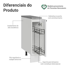 O organizador metálico interno possui deslizamento suave com abertura total, facilitando o uso no dia a dia. As dobradiças com amortecimento garantem fechamento silencioso, enquanto os pés reguláveis e o rodapé removível tornam a limpeza mais simples.
