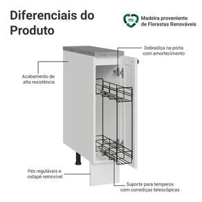 O organizador metálico interno possui deslizamento suave com abertura total, facilitando o uso no dia a dia. As dobradiças com amortecimento garantem fechamento silencioso, enquanto os pés reguláveis e o rodapé removível tornam a limpeza mais simples.
