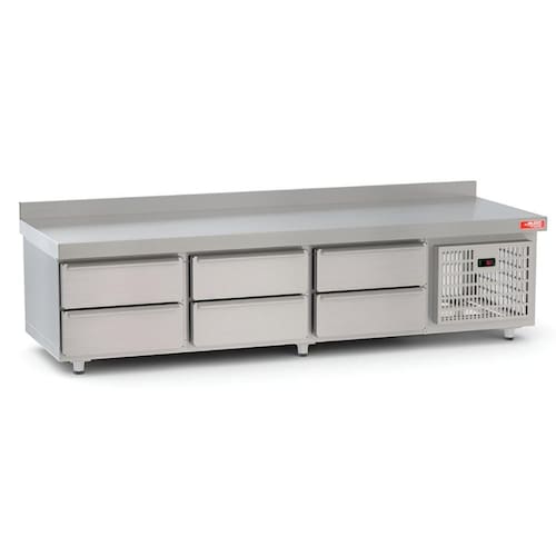 Características Técnicas: Sistema de refrigeração por ar forçado Temperatura de trabalho: 0 a 10C Controlador digital de temperatura Revestimento interno e externo em aço inox Isolamento térmico em poliuretano injetado (lã de rocha na parte superior) Gavetas em aço inox sobrepostas e reforçadas com corrediças Pés com regulagem de altura Potência: 200W Possui 6 gavetas