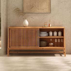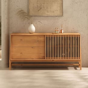 Feito de madeira. Feito para durar. Compacto, funcional e cheio de estilo, o Balcão Adamo 145 cm é a escolha ideal para quem busca um móvel de presença marcante mesmo em espaços menores. Produzido em madeira maciça com acabamento em tom Freijó, valoriza a textura natural da madeira e traz aconchego visual ao ambiente. Seu design combina linhas minimalistas e estrutura leve, perfeita para salas de jantar, estar ou ambientes integrados. A porta ripada deslizante com sistema fecho-toque adiciona um toque contemporâneo, mantendo o visual limpo e sofisticado. As duas gavetas amplas com corrediças telescópicas e interior preto oferecem organização inteligente para louças, utensílios ou itens pessoais, enquanto o tampo superior robusto serve como apoio decorativo ou funcional, ideal para vasos, bandejas e objetos de design. A estrutura elevada com pés em madeira maciça reforça a estabilidade e facilita a limpeza, sem abrir mão da leveza visual que define toda a Linha Adamo. Versátil e elegante, o Balcão Adamo 145cm se adapta com harmonia a diferentes estilos de decoração, um móvel essencial para quem busca design natural, proporções equilibradas e o charme atemporal da madeira maciça.