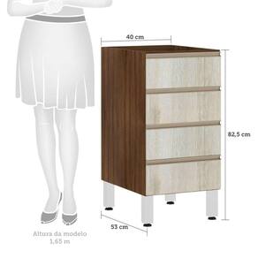 Características Corpo/Caixaria: MDP - Nogueira Dourado - FF. Frontais: MDP - Acabamentos em BP. Dobradiças: 35mm Slow motion. Puxadores: Alumínio Gola - Inox. Pés: P S - Cromado Corrediças Telescópicas: Abertura Total das Gavetas. Puxadores: Alumínio Gola - Inox. Gavetas: 4 Montagem com Minifix, Parafusos e cavilhas.