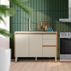 Um balcão de 120 cm feito completamente em MDF com acabamento em PVC, oferecendo gavetas com corrediças telescópicas e porta com dobradiças amortecidas, combinando durabilidade, funcionalidade e um fechamento suave para a cozinha.