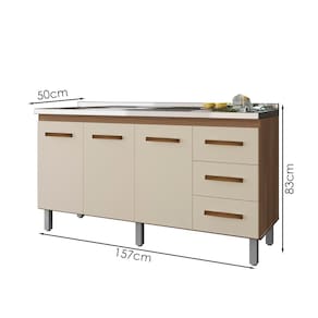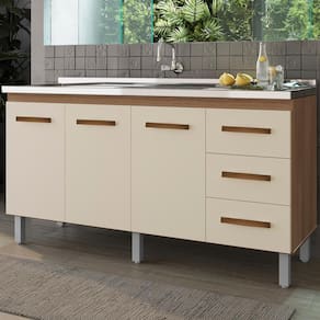 Balcão Sem Tampo Para Pia Emily, uma excelente opção para sua casa. Estrutura em MDP de 12/15mm, com acabamento em pintura UV. Composto por 03 portas com dobradiças metálicas, uma prateleira interna para maior aproveitamento do espaço, 03 gavetas com corrediças metálicas, ideal para usar com pia de 160cm (pia não inclusa), puxadores em plástico cromado, pés fixos de 16,5cm que garantem a firmeza que o móvel precisa, possui perfeita combinação com os mais variados ambientes. Você pode compor sua cozinha da forma que desejar. Este móvel chegará em sua casa separado em 01 volume.