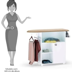 Dimensões da Tábua de Passar com Armário: - Produzida em MDP; - Pintura UV; - 1 porta com dobradiças metálicas; - Prateleira; - Passadeira revestida com tecido e espuma; - Porta Cabide; - Porta Ferro; - Puxadores de plástico resistentes; - 1 Nicho; - Não acompanha objetos de decoração;