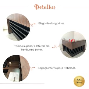 Deseja um ambiente corporativo elegante para receber bem seus convidados e clientes? O Balcão Tamburato Atendimento II é perfeito para isso, pois é um produto sofisticado e ideal para atendimentos. Elegantes longarinas horizontais no produto proporcionam equilíbrio ao ambiente, e peças de Tamburato de 50mm de espessura certificam muita robustez e qualidade. Além disso, na parte interna há amplo espaço para trabalhar de forma organizada e eficiente. Produzido com um alto padrão de qualidade, este produto é revestido por BP, o que garante um acabamento uniforme e resistente ao atrito e umidade.