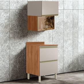Conjunto Balcão e Armário Proença, ideal para otimizar o espaço da cozinha com praticidade. Produzidos 100% em MDF (15 mm) com acabamento em pintura UV. Conta com portas basculantes com pistão a gás e dobradiças metálicas de 35 mm (sendo uma com vidro Reflecta de 3 mm), gavetão inferior com corrediças telescópicas e puxadores em alumínio. Além de pés com regulagem de altura e tampo (20 mm) já inclusos no balcão. Este produto será entregue em 03 volumes.