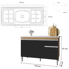 Dimensões do Balcão: Altura: 81 cm Largura: 118 cm Profundidade: 50 cm Dimensões da Pia e Cuba: Altura: 13,5 cm Largura: 120 cm Profundidade: 53 cm