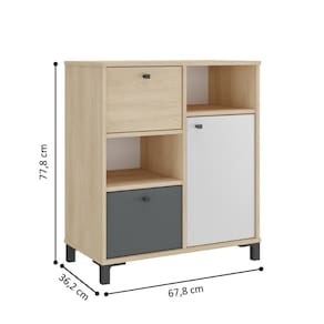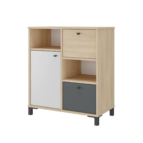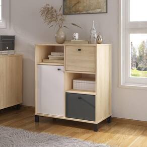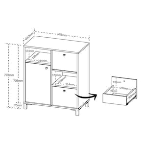 Ela possui um design escandinavo elegante. Possui uma porta e duas gavetas, com prateleira interna com regulagem de altura e gavetas que podem ser montadas em qualquer ordem.