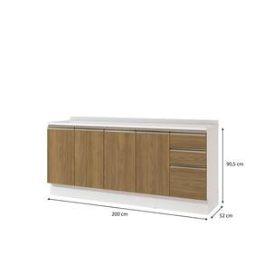 Com amplo espaço, são três gavetas e muitas prateleiras, permitindo organizar louças e mantimentos. O destaque fica para as corrediças telescópicas nas gavetas, que permitem a abertura total, e as dobradiças com amortecimento nas portas, para um fechamento suave e sem ruído. Para um melhor acabamento, os balcões contam com rodapé, mas acompanham as ferragens para serem montados suspensos, garantindo muita praticidade.