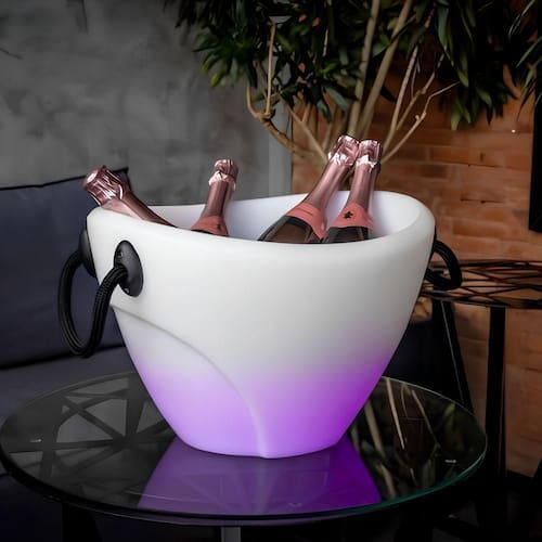 A estética impressionante do balde é realçada por suas luzes LED, que criam uma atmosfera contemporânea e vibrante, perfeita para qualquer ocasião. Seja em um jantar, uma festa na piscina ou um happy hour, este balde se destacará como o centro das atenções, elevando o nível do seu evento para um patamar de sofisticação.