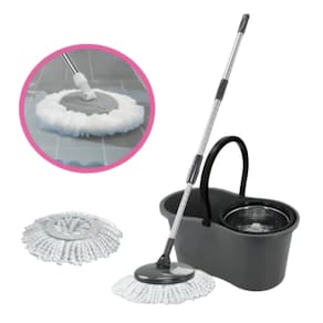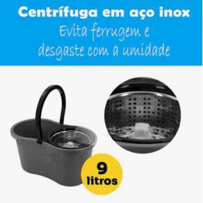 - ACOMPANHA: 1 Refil esfregão de microfibra - 1 Balde mop (contém dentro um balde de aço independente) - 1 Balde de aço independente para secagem - 1 Cabo Mop completo regulável