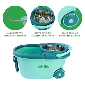 O balde mop 360graus da mixtou é perfeito para a limpeza geral nos mais diversos ambientes. Com design moderno, tem capacidade para 18 litros e conta com um eficiente sistema de centrifugação, além de dispenser para produtos químicos, alça e rodinhas para facilitar o transporte, proporcionando maior ergonomia e praticidade durante a utilização.