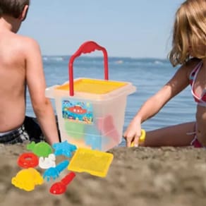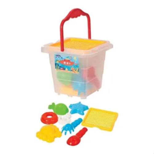 O balde de praia contém vários moldes para diversão na areia. Acompanha pá, rastelo, peneira e moldes para areia.