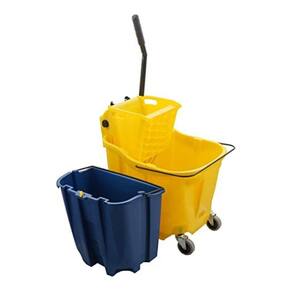 Grandes quantidades de água e solução de limpeza podem ser movidas facilmente em rodas duráveis com tecnologia anti salpicos e anti dica.A capacidade de 35 litros permite limpar mais com menos viagens. A alça ergonômica do espremedor de uma peça foi redesenhada para impedir que suas mãos se cansem e é classificada para durar 200.000 ciclos. Todas as peças são feitas com plástico de polietileno resistente a corrosão e resistente à corrosão, tornando as mais seguras e fáceis de manter limpas. Esses baldes de esfregona vêm em uma seleção de cores e são feitos para atender às diretrizes HACCP