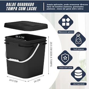 Embora não seja adequado para armazenar alimentos, o balde é perfeito para o envase e armazenamento de produtos como tintas, argamassas, graxas, cimento queimado, massa corrida, epóxi, compostos para compostagem, óleos industriais, detritos, granulados, pastosos, líquidos e outros materiais utilizados na construção civil e indústrias.