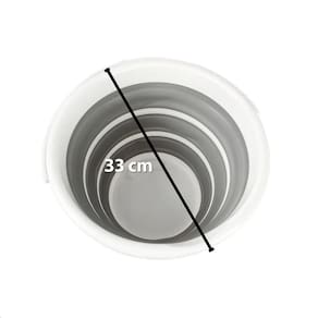 O Balde de Limpeza Dobrável Com Alça Multiuso 10 Litros possui um design moderno nas cores branco e cinza, trazendo um toque de elegância para suas tarefas domésticas. Ele conta com uma alça resistente, facilitando o transporte e manuseio do balde.