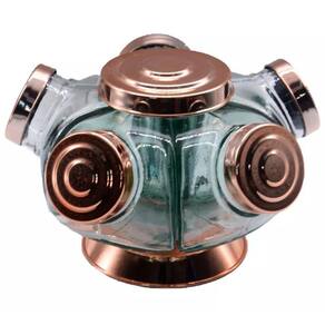 Porta Doce Baleiro Giratório Mini 5 Potes Baleiro de vidro MINI para para uso pessoal como peça de decoração devido seu estilo conservador Com visual retrô e beleza rara este produto atende a todos os tipos de consumidores ávidos por produtos diferenciados e ao mesmo imunes ao tempo. Obs: As pequenas imperfeições, tais como irregularidades na espessura, no peso ou no diâmetro e as pequenas bolhas, que às vezes se formam dentro do vidro, são a clara garantia de um produto feito artesanalmente. Ficha Técnica: Baleiro de vidro giratório mini 05 potes Boêmia 1 andar tampa plástico Vidro transparente Capacidade 250 ml por gomo - Total: 1,250 litro Tampa com rosca em plástico polido Base em plástico Cor Cobre Dimensões do MINI baleiro: Comprimento 22 cm Altura 13,5 cm Profundidade 22 cm Peso líquido 2,290 kg Marca: Não Informado