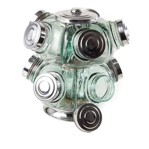 Ficha técnica: Baleiro de vidro giratório médio 10 potes Vidro transparente. Capacidade 700 gramas por gomo. Tampas metálica na cor alumínio polido. Base metálica na cor alumínio polido. Obs: a variação da capacidade de armazenar por gomo dependera do produto a ser armazenado.