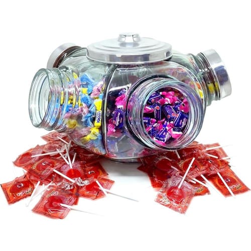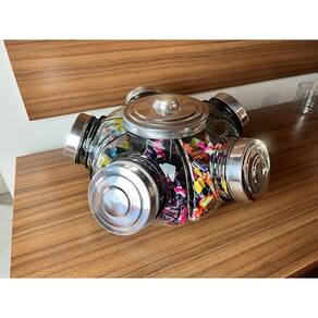 Super porta doce baleiro grande giratório 5 potes - baleiro artesanal + ( mini-baleiro fusquinha ) ideal para presentear/decorar Ideal para comércio - grande capacidade de 3.5 kg de balas e doces Baleiro artesanal com visual retrô atende a todos os tipos de consumidores ávidos por produtos diferenciados e ao mesmo imunes ao tempo.Podendo ser usado em estabelecimentos e em sua própria residência como item de decoração na sala, sala de estar, salão de festas,etc.. Com vidro transparente para ver todos os itens que colocar dentro: Balas, doces e até cápsulas de café. Produto 100% artesanal e com acabamento diferenciado e resistente. Obs: as pequenas imperfeições, tais como irregularidades na espessura, no peso ou no diâmetro e as pequenas bolhas, que às vezes se formam dentro do vidro, são a clara garantia de um produto feito artesanalmente. Ficha técnica: - baleiro de vidro grande giratório 05 potes - vidro transparente - capacidade 700 ml por gomo/pote- rolamento axial- tampa em aluminio - base super firme e segura com rolamento - cor: prata ( aluminio ) Dimensões do baleiro: - altura 25 cm- diametro total 40 cm- diametro da boca 9 cm Itens inclusos: Baleiro giratório grande de aluminio + mini baleiro fusquinha Marca: Houme