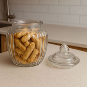 Seu design redondo com textura canelada traz um toque retrô elegante, perfeito tanto para o uso diário quanto para compor a decoração de bancadas, prateleiras ou mesas. A tampa com vedação hermética ajuda a preservar os alimentos por mais tempo, protegendo contra umidade e odores externos.