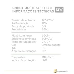 Tensão de entrada: 127-220V Potência total: 12W Fator de potência: 0,5 Frequência: 60Hz Fluxo luminoso: 600lm Eficiência luminosa: 50lm/W Temperatura de cor: 2700K Cor: Branco Quente IRC: 80 Ngulo de radiação: 30 Dimensões: 12x9 cm Índice de proteção: IP67 Ean: 7908163127578