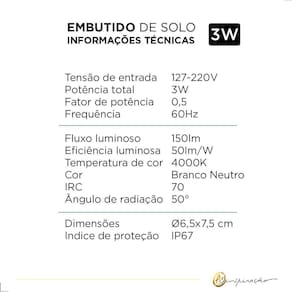 Tensão de entrada: 127-220V Potência total: 3W Fator de potência: 0,5 Frequência: 60Hz Fluxo luminoso: 150lm Eficiência luminosa: 50lm/W Temperatura de cor: 4000K Cor: Branco Neutro IRC: 70 Ngulo de radiação: 50 Dimensões: 6,5x7,5 cm Índice de proteção: IP67