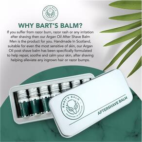- Por que o BART'S BALM? - Se você sofre de queimaduras de lâmina, erupção cutânea ou qualquer irritação após o barbear, nossa coleção de bálsamos pós-barba é o produto para você. Feito à mão na Escócia, adequado até mesmo para as peles mais sensíveis, nossos bálsamos pós-barbear com óleo de argan foram especificamente formulados para ajudar a reparar, acalmar e acalmar sua pele, após o barbear, ajudando a aliviar qualquer pelos encravados ou solavancos de lâmina.
