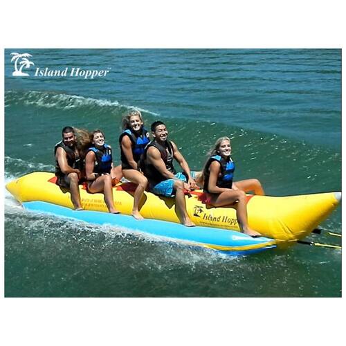 Carregue 5 pessoas em um banana boat e nós os desafiamos a não sorrir Material Resistente a UV resistente a UV reforçado Qualidade Costuras soldadas para durabilidade e longevidade. Anéis de tração de aço inoxidável, arnês de reboque com alavanca de aço Dimensões infladas 5 m x 1,2 m x . Carga máxima 5 pilotos 462 kg Inclui bolsa de zenamento de nylon, bomba de pé e instruções de operação. Caixa dupla para entrega segura Marca: Não Informado