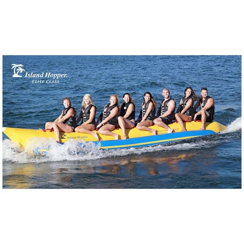 Barco de banana de nível projetado para acomodar 8 amigos em qualquer condição de água. Material Resistente a UV reforçado 1100 denier. Material denso resistente a perfurações, reforçado em áreas de alta tensão. Qualidade costuras soldadas e nariz vem para resistência e vida útil prolongada. Anéis de tração de aço inoxidável, arnês de reboque com alavanca de aço Dimensões infladas 6 metros Comprimento x 1,2 m. Carga máxima 8 pilotos 765 kg Marca: Não Informado
