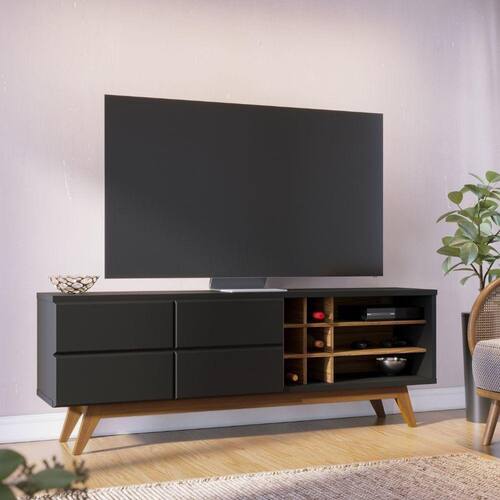 Bancada Colibri Noronha 2 Portas Preto Fosco /noce Milano Com um visual urbano e moderno, a bancada rack Noronha e um movel multifuncional, ideal para compor salas de estar e home cinemas. Com medidas amplas possui um tampo que permite acomodar uma TV de ate 70 polegadas ou servir de apoio para livros, adornos, aparelhos eletronicos e demais objetos decorativos. Contem tambem nichos internos, adega com porta-garrafas para ate 6 unidades e pes em madeira macica. Acabamento: Pintura Possui Pes: 4 Possui Nichos: 3 Tipo de Porta: Bater Possui Gavetas: Nao Escala de Brilho: Fosco Material dos Pes: Madeira Macica Material da Porta: MDF Origem do Produto: Nacional Ambiente Principal: Sala de Estar Material Principal: MDP Acabamento da Porta: Pintura Material da Prateleira: MDP Quantidade de Espelhos: Nao se aplica Acabamento da Prateleira: Pintura UV Tipo de Puxador da Porta: Embutido Escala de Brilho da Porta: Fosco Ideal para TVs ate (Polegadas): 70 Escala de Brilho da Prateleira: Fosco Tipo de Madeira Macica dos Pes: Eucalipto Possui Rodizio: Nao Possui Iluminacao: Nao Sapatas Niveladoras: Nao Marca: Colibri Suporta Ate (kg): 49 Peso Maximo por Prateleira: 2 kg