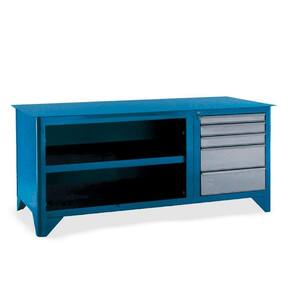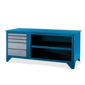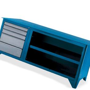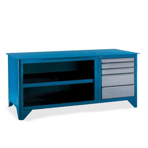 Bancada Industrial Fixa com 5 Gavetas e Tampo de Aço é fabricado em chapas de aço carbono resistentes, recebe tratamento de superfície anticorrosivo e finalmente recebe um acabamento de tinta eletrostática a pó.
