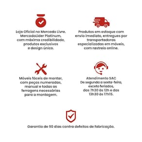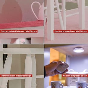 * APÓS O PEDIDO FINALIZADO, NÃO ACEITAMOS TROCA DE COR DO PRODUTO E NEM ALTERAÇÃO DE ENDEREÇO DE ENTREGA.FOTOS DOS PRODUTOS REAIS.Transforme sua cozinha com a elegante e funcional Bancada de Cozinha Gourmet Ditália, acompanhada de duas banquetas e um kit luz com 3 lâmpadas de LED de 5 watts cada e 1 controle remoto. Essa bancada de cozinha oferece não apenas um visual deslumbrante, mas também uma organização impecável.Com três prateleiras capazes de suportar até 5 kg cada e um tampo resistente que suporta até 30 kg, ela é prática, funcional e segura, além de acomodar utensílios domésticos, objetos decorativos e bebidas, a bancada proporciona momentos agradáveis de preparação de alimentos e descontração, reunindo as pessoas queridas ao redor de um espaço acolhedor. Com acesso facilitado às três prateleiras em um dos lados e espaço para duas banquetas no outro, essa bancada gourmet é perfeita para atender a todas as suas necessidades. CARACTERÍSTICAS DA BANCADA- Estrutura em MDP 15 mm com revestimento em pintura UV fosca.- Estruturas laterais em MDF 50 mm, super-resistentes.- Tampo padrão Riviera (tom de cor bege claro) em MDP 30 mm, com revestimento em melamina, ideal para manipular alimentos.- Base superior suporta até 30 kg.- Possui 3 prateleiras que suportam até 5 kg cada.- Peso: 23,40 kg- Largura: 90 cm- Altura: 91 cm- Profundidade: 60 cmCARACTERÍSTICAS DA BANQUETA (UNIDADE)- Madeira maciça de eucalipto- Peso: 3 kg- Largura da base: 38 cm- Altura: 76 cm- Diâmetro assento: 29 cmKIT LUZ- Kit com 3 lâmpadas de LED de 5 watts cada e 1 controle remoto.- 2 níveis de ajuste de brilho, timer de 30 minutos e botão liga/desliga via controle remoto.- É possível também ligar e desligar tocando no interruptor diretamente na lente das luzes.- Fácil fixação com adesivo dupla face.- Alimentado por pilhas AAA (JÁ INCLUIDAS).- Dimensão das lâmpadas: 9x7x2,1 cm.- Dimensão do controle remoto: 8x5,9x1,5 cm.Acompanha kit ferragens e manual de montagem (montagem não inclusa).Este produto é vendido desmontado em 4 volumes, embalados em caixa de papelão com isopor nas laterais e revestidos com plásticos termoencolhível.A fixação é feita por girofix, cavilhas e parafusos, não é necessário parafusar na parede.1 - O produto é entregue montado?Resposta: Nossos produtos são entregues desmontados. Os móveis são acompanhados de todos componentes necessários (manual de montagem, parafusos, pregos, puxadores e etc..) para que possam ser montados com facilidade.2 - Vocês oferecem serviço de montagem?Resposta: Não disponibilizamos este serviço.3 - Qual o valor da entrega?Resposta: O valor referente a entrega dependerá do destino final da mercadoria, para calcular o valor, é considerado o CEP do consumidor.4 - Os produtos são novos?Resposta: Sim, trabalhamos apenas com produtos novos.5 - Vocês atendem todos os estados do Brasil?Resposta: Sim, enviamos nossos produtos para todo o Brasil.6- Acompanha as banquetas?Resposta: Sim, acompanham duas banquetas.7- Acompanha kit luz?Resposta: Sim, acompanha o kit luz com um controle remoto.LIMPEZALimpar utilizando apenas pano umedecido com água, nunca utilizar abrasivos ou esponjas de aço.GARANTIAGarantia de 3 meses (contra defeitos de fabricação).OBSERVAÇÕES- Montar o móvel com o produto virado de costas, para montagem, forrar o chão com o papelão das embalagens.- Não expor o móvel a fontes de calor ou de umidade.- As imagens indicam uma sugestão de uso e são apenas ilustrativas, os objetos decorativos não estão inclusos.- As cores dos produtos podem variar devido à reprodução sobre a tela do dispositivo.