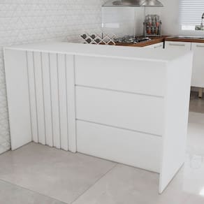 O(a) Bancada de Cozinha Alta Ilha Gourmet Ripado Branco - Loja é produzido em MDF na escala de brilho Fosco e Semi-Brilho, e possui um grau de dificuldade de montagem: Médio.