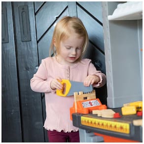 Grande Oficina Interativa: Com espaço suficiente para várias crianças, esta bancada permite que elas finjam construir e consertar projetos. Inclui furos para parafusos, reentrâncias para porcas e armazenamento de parafusos, promovendo brincadeiras colaborativas e criativas.